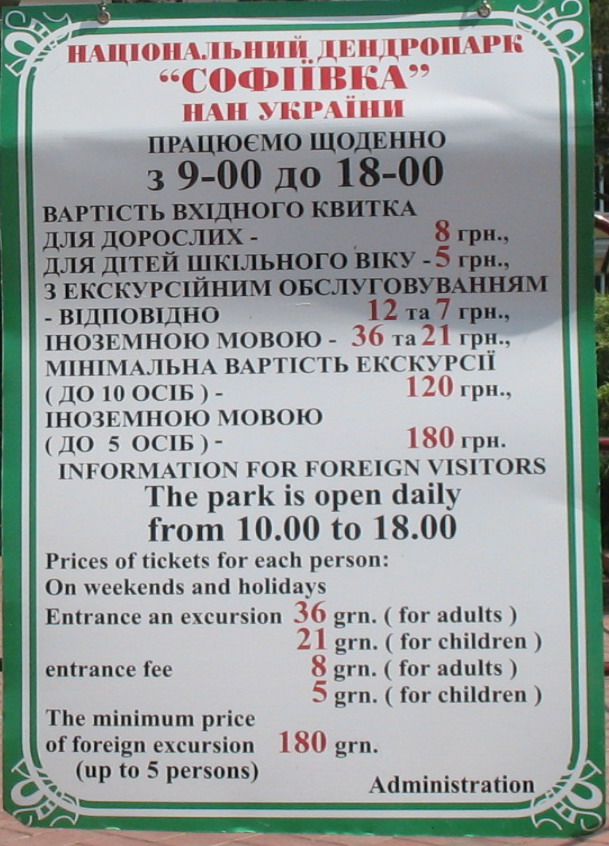 | 2007г., Умань, дендрологический парк "Софиевка" Центральная часть парка - одно из многочисленных озёр на территории парка. Расценки на 2007 год тоже были не очень хитрые - приведены на фото. .. после 18:00 на входе вообще нет никакого контроля, и можно спокойно взяв пива погулять по территории парка. Правда за один вечер весь парк не обойти, поэтому рекомендую посвятить этому делу целый день. Получите море удовольствия от красивых видов и множества природных экспозиций.